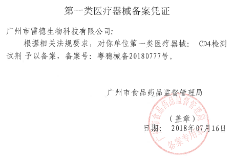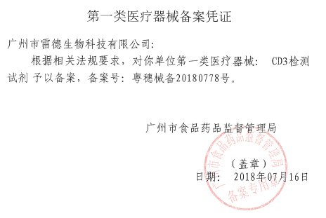 2018年7月16日,我公司自主研發(fā)的4款流式抗體產(chǎn)品“CD3、CD4、CD8、CD45檢測試劑”均通過了廣州市食品藥品監(jiān)督管理局的Ⅰ類醫(yī)療器械產(chǎn)品審批備案,正式獲準(zhǔn)上市銷售。
