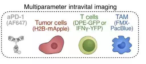 這就要感謝活體顯微鏡技術的出現(xiàn)。為了在顯微鏡下看到藥物起作用的整個過程,Pittet教授團隊給PD-1抗體加了個黃色標記。然后利用活體顯微鏡來實時監(jiān)測標記后的PD-1抗體在結腸癌小鼠模型中的動向。