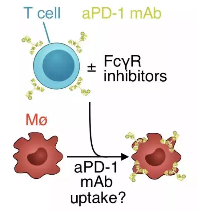 既然腫瘤相關巨噬細胞并不與PD-1抗體結合,也不會在標記的PD-1抗體注射的 早期吃掉PD-1抗體。因此研究人員推測,PD-1抗體的轉移是通過一種非抗原特異性機制。隨后研究人員發(fā)現(xiàn)巨噬細胞表面存在Fcγ受體,這一受體與T細胞PD-1抗體復合物上Fc結構域相結合,介導PD-1抗體的吞噬。