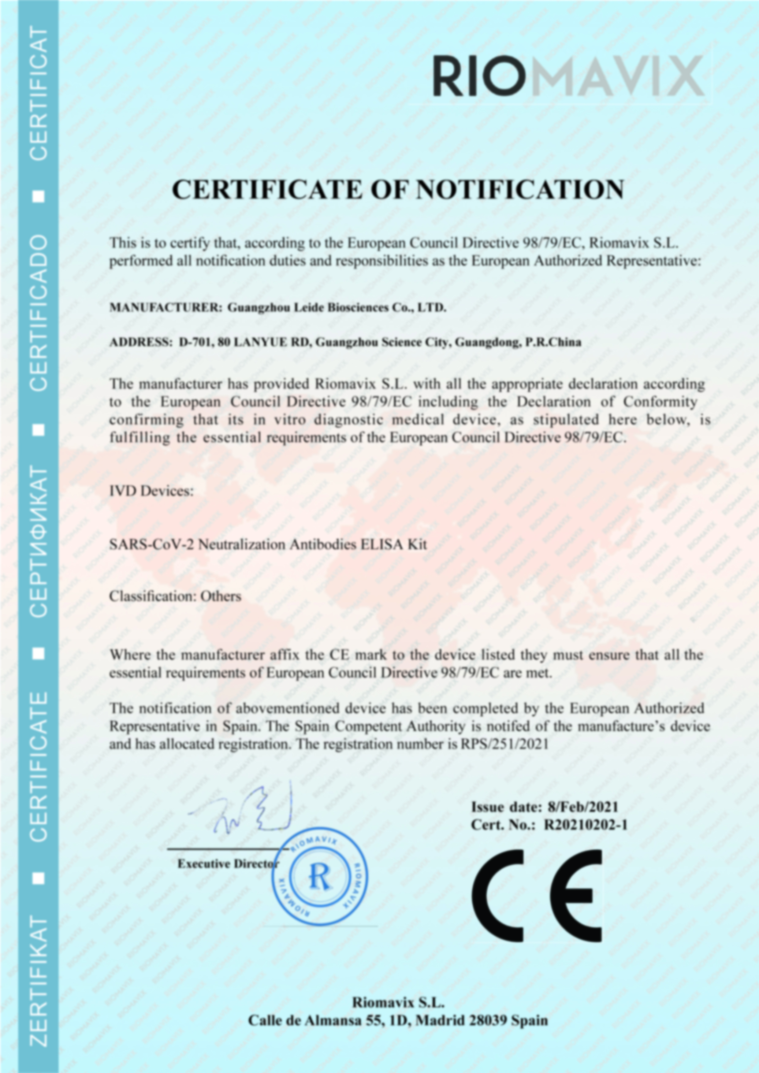 近日,由廣州市雷德生物科技有限公司(簡(jiǎn)稱“雷德倍爾”)自主研發(fā)的新型冠狀病毒(2019-nCov)特異性細(xì)胞免疫反應(yīng)檢測(cè)試劑盒以及新型冠狀病毒(2019-nCov)中和抗體檢測(cè)試劑盒(ELISA),于2021年2月8日獲得CE認(rèn)證。